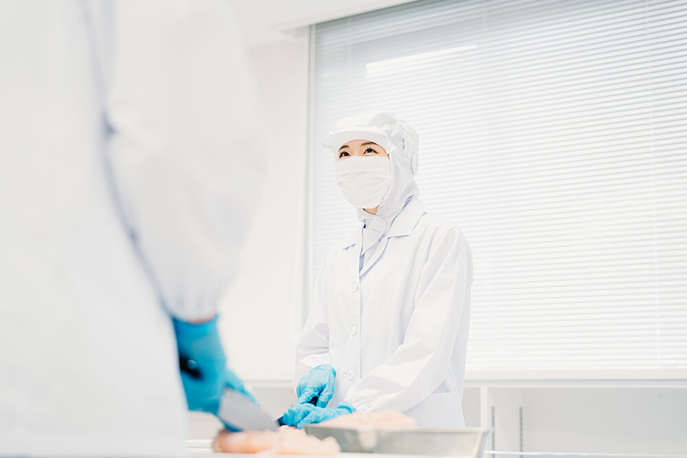 マルセ食品の工場では、HACCPの手法を取り入れた衛生管理を徹底しています。加工工程ごとに衛生チェックを行い、常に工場内を約10℃に保つことで菌の繁殖を抑制。適正な衛生設備と清潔な環境を維持し、安全で高品質なお肉を安定的にご提供しています。さらに、従業員への衛生教育やマニュアル運用も徹底しており、日々の管理体制を強化。こうした取り組みにより、飲食店や小売業のお客様に安心してご利用いただける食材をお届けしています。